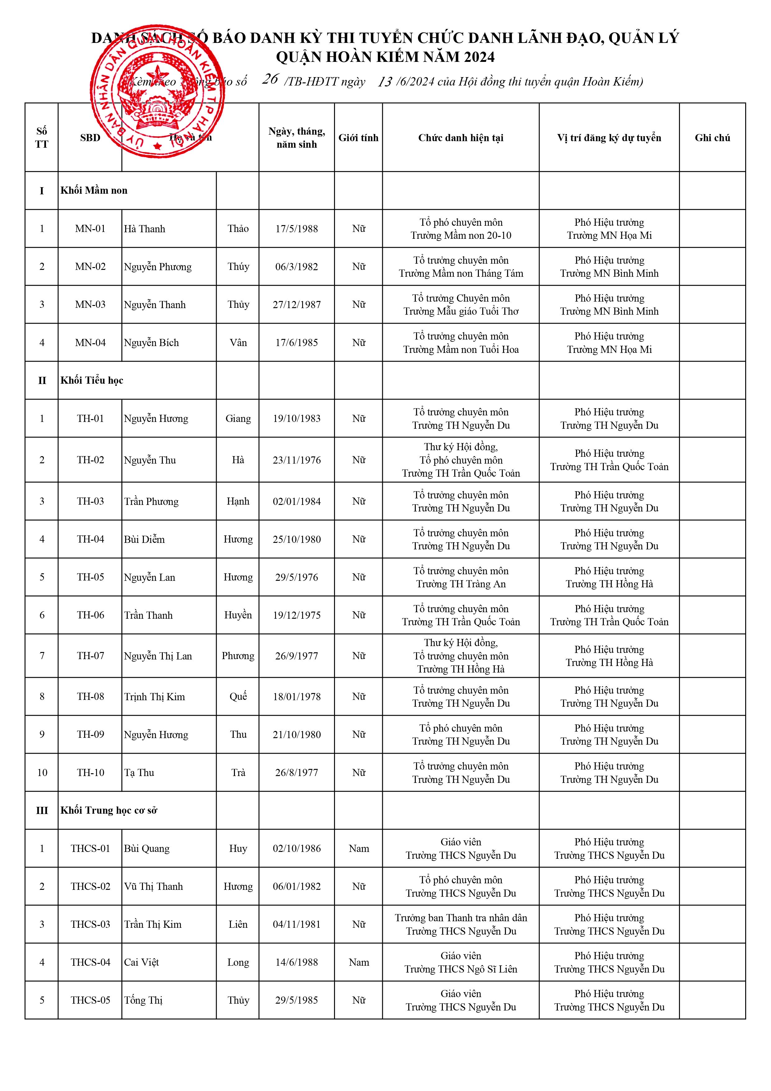 plus-circle Created with Sketch Beta. Aa Thông báo danh sách số báo danh Kỳ thi tuyển chức danh lãnh đạo, quản lý quận Hoàn Kiếm năm 2024 09:19 14/06/2024 Xem Thông báo tại đây
